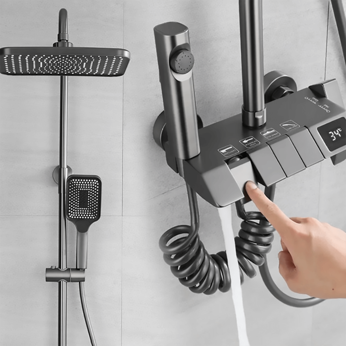 - Режимыобычный смеситель (слив вниз), пистолет-распылитель с сильной струей, рукоятка с мягкими режимами, верхняя насадка с тропическим душем; переключение между режимами путем нажатия "клавиш"